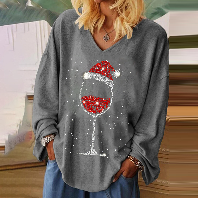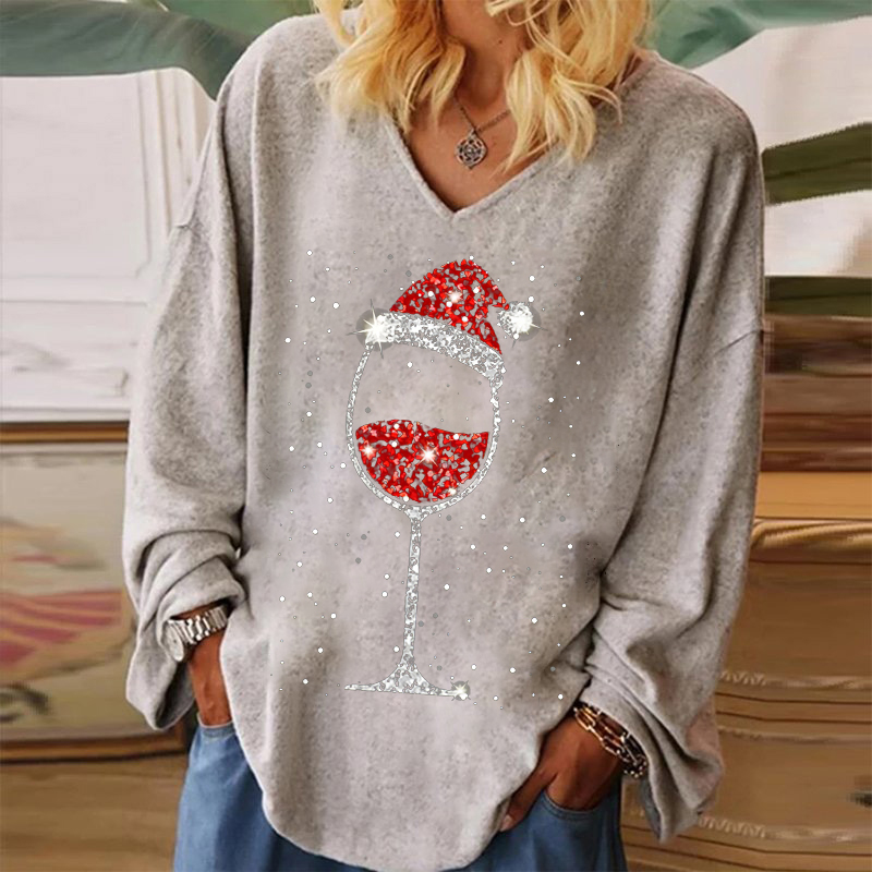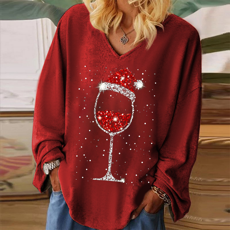 • Christmas Hat Wine Glass Printed V-neck Women's T-shirt