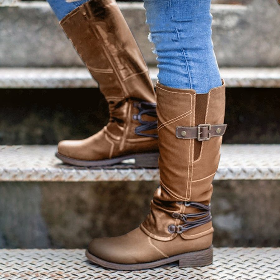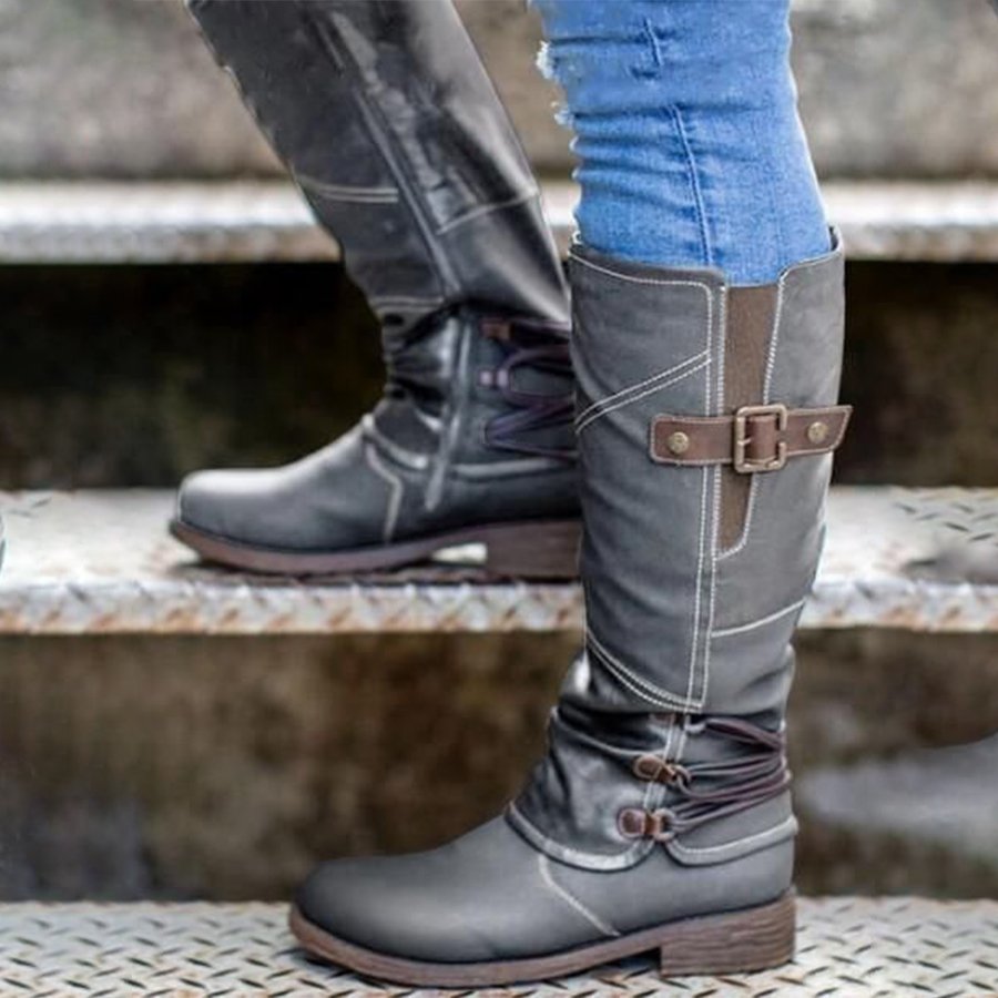 • Women's Western Round Toe Square Heel Buckle Knight Boots