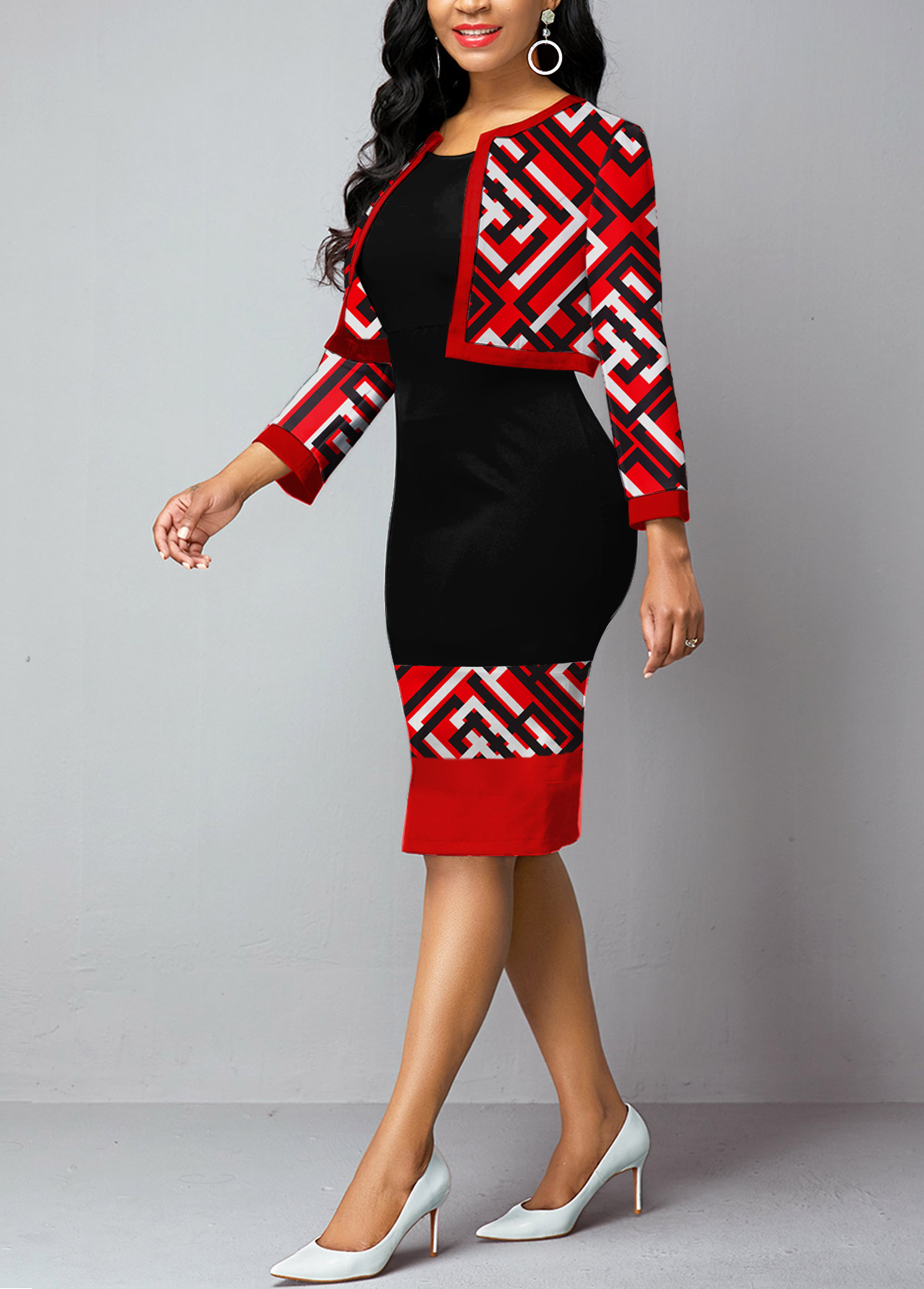 Geometric PrintRed Long Sleeve Bodycon Dress and Cardigan