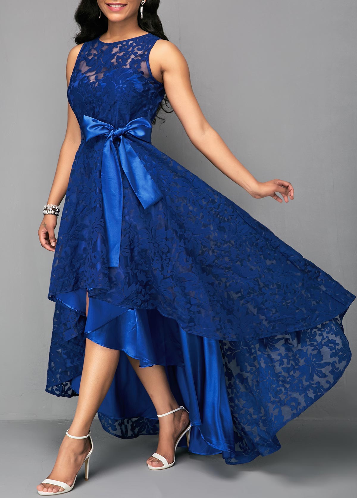 • High Waist Belted Lace Panel Maxi Dress